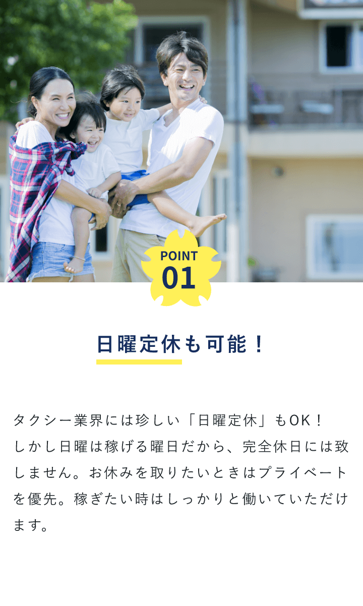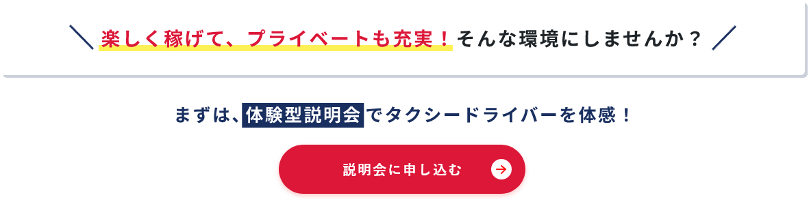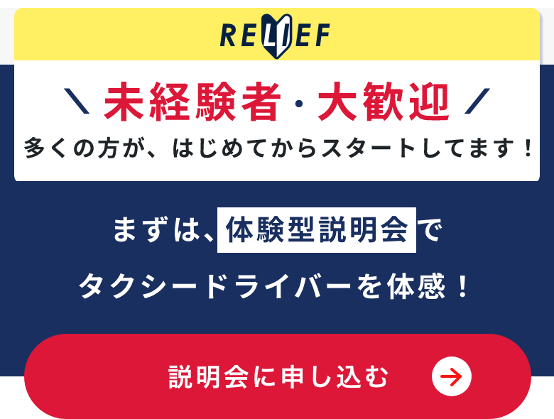 | 職種詳細 | 正社員、定時制: タクシー乗務員 ※首都圏を中心に、タクシー運行を行っていただきます。 普通1種免許しかお持ちでない方でも、当社の教育システムによる指導で短期養成で2種免許が最短8日間で取得できます。(免許取得費用は全額会社負担 ※社内規定有) |