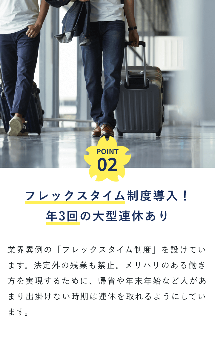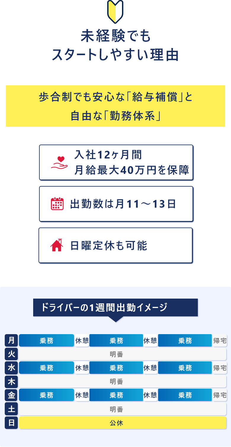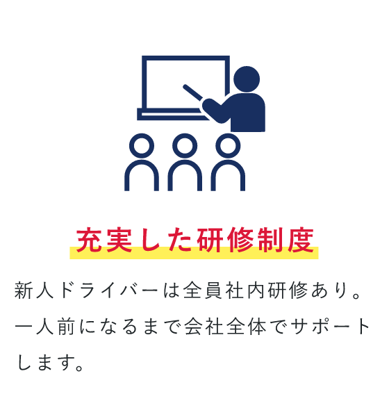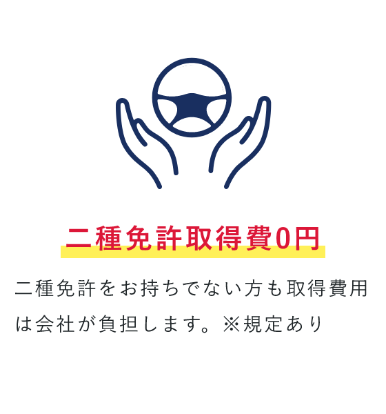 | 教育制度 | 今回の募集では、ドライバー経験は不問。 入社後はまず、2種免許資格の取得から スタートしていただきます(免許取得費用は全額会社負担)。 他にも、接客の基礎知識をお教えしたり、ルートの構築をサポートしたりするなど、バックアップ体制は万全です。 |