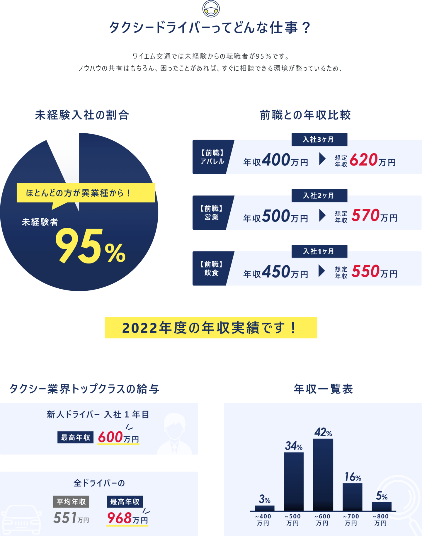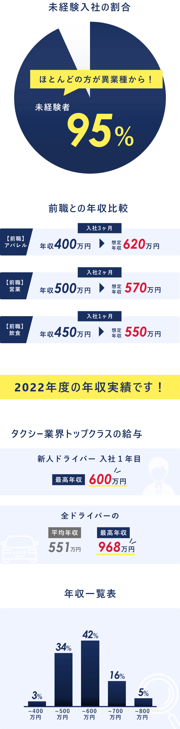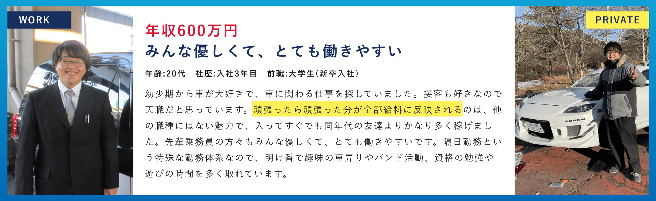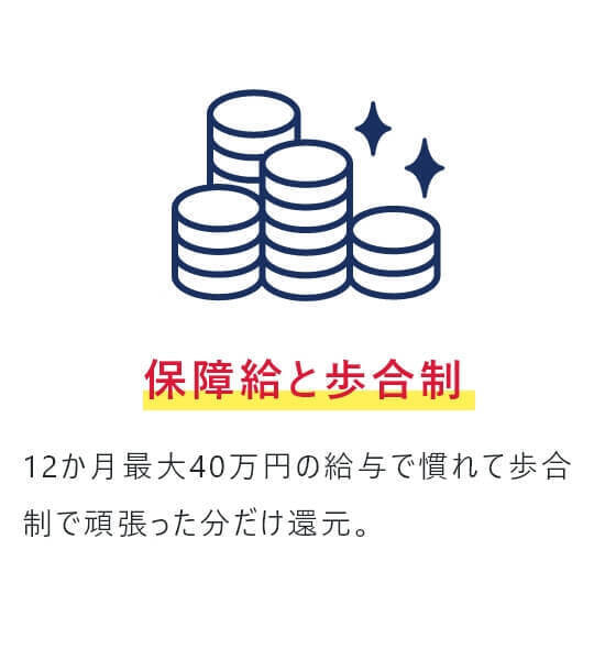 | 入社後の想定給与 | 月給:40万円以上 ◆入社後1年間は給与保証あり! 乗務開始~3か月間:月給40万円 4~12か月目:月給35万円 ※2月1日~4月30日迄の応募者が対象※規定有 ◆給与保証額を超える売上を確保できた場合は、その分を上乗せした給与を支給 平均月給57万円★年収800万円を超える社員も在籍 ◆入社後13ヶ月以降 最低保証金額(基本給) ┗月給190,575円+歩合+手当 ◆配属前の研修期間中(最長3ヶ月)は日給1万円+交通費支給 モデル年収 968万円/未経験入社6年目(月給19万575円+歩合+賞与3回) 790万円/未経験入社2年目(月給19万575円+歩合+賞与3回) 564万円/入社1年目の平均年収((月給40万円×3ヶ月+月給35万円×9ヶ月)+歩合+賞与3回) 【固定給+歩合給】で頑張りをしっかり評価! 未経験から入社した先輩も、年収700万円を実現しています! 『高給料の理由』 他社に比べ、売上は乗務開始から数年後には大きくリードしています。 一人一人の売上が高い=給与額が大きいことが高い業績に繋がっています。 <「日経MJ」2011.11.16発行掲載データより> |