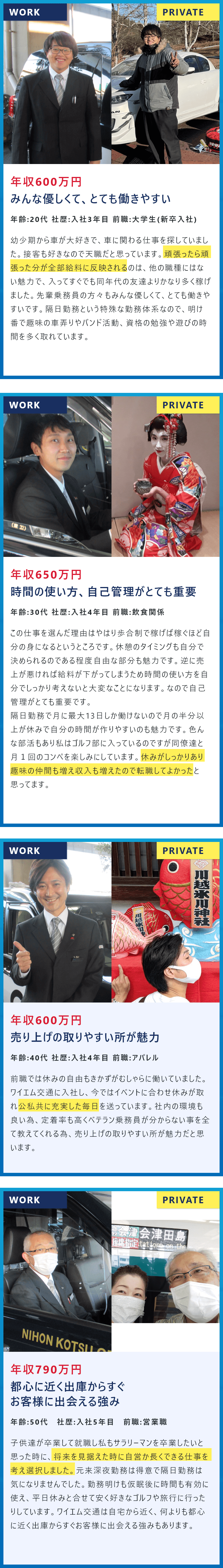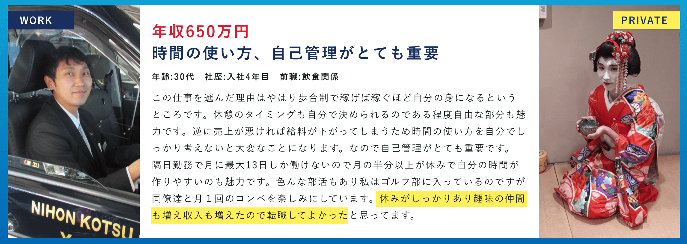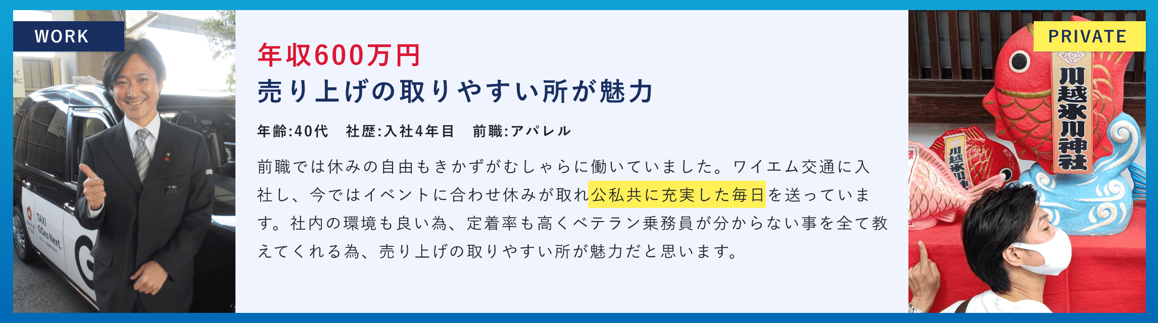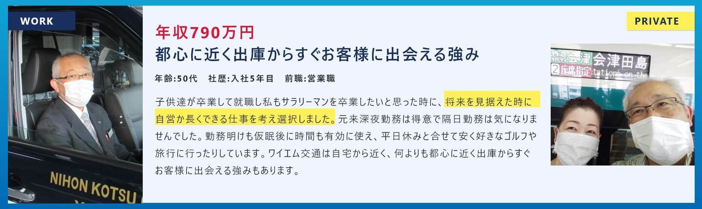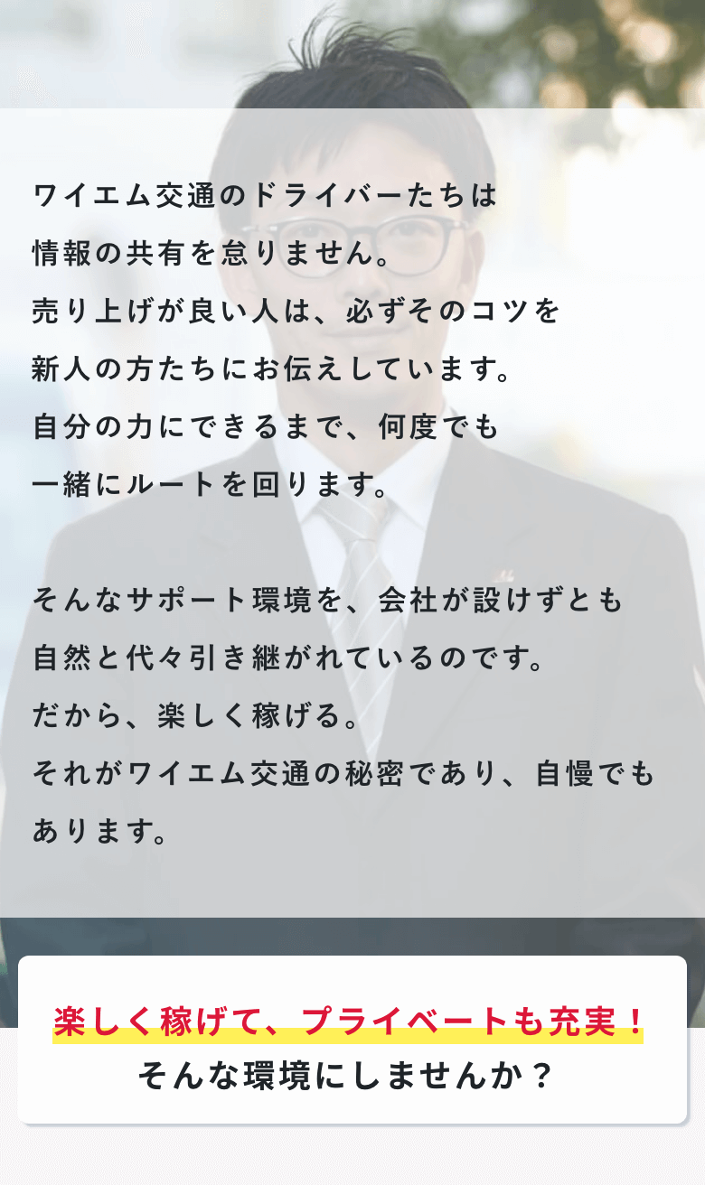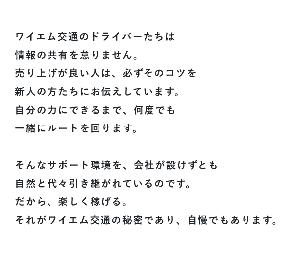 ノウハウの共有はもちろん、困ったことがあれば、すぐに相談できる環境が整っているため、日本交通グループの中でも高水準な年収を維持しています。