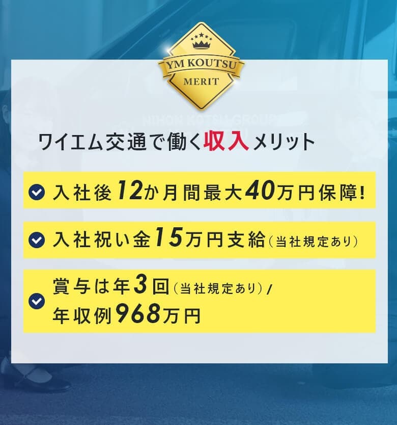 月給:40万円以上 ◆入社後1年間は給与保証あり! 乗務開始~3か月間:月給40万円 4~12か月目:月給35万円 ※2月1日~4月30日迄の応募者が対象※規定有 ◆給与保証額を超える売上を確保できた場合は、その分を上乗せした給与を支給 平均月給57万円★年収800万円を超える社員も在籍 ◆入社後13ヶ月以降 最低保証金額(基本給) ┗月給190,575円+歩合+手当 ◆配属前の研修期間中(最長3ヶ月)は日給1万円+交通費支給 モデル年収 968万円/未経験入社6年目(月給19万575円+歩合+賞与3回) 790万円/未経験入社2年目(月給19万575円+歩合+賞与3回) 564万円/入社1年目の平均年収((月給40万円×3ヶ月+月給35万円×9ヶ月)+歩合+賞与3回) 【固定給+歩合給】で頑張りをしっかり評価! 未経験から入社した先輩も、年収700万円を実現しています! 『高給料の理由』 他社に比べ、売上は乗務開始から数年後には大きくリードしています。 一人一人の売上が高い=給与額が大きいことが高い業績に繋がっています。 <「日経MJ」2011.11.16発行掲載データより> |