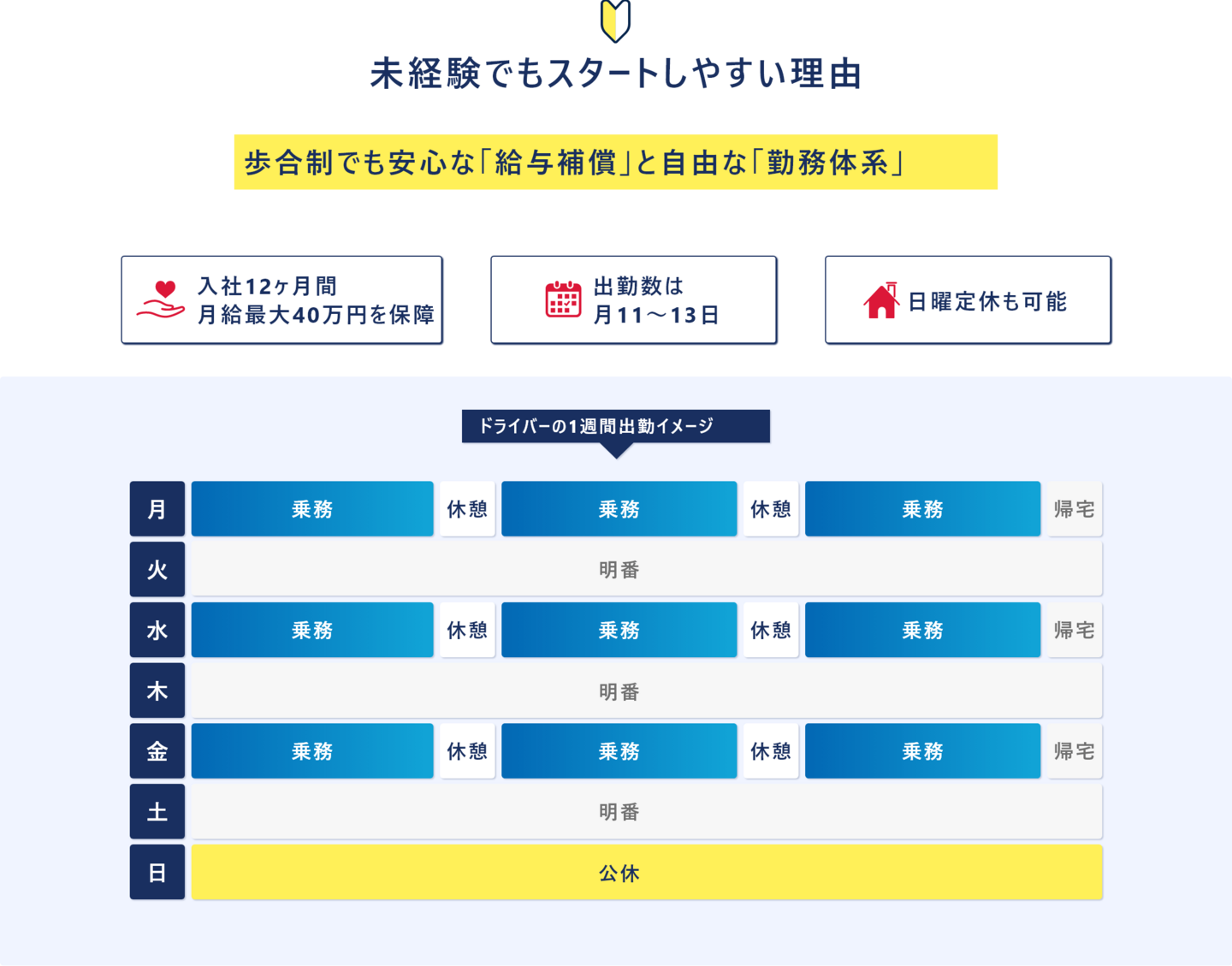 隔日勤務(月11~13回乗務):1日勤務して1日休みの勤務シフト 実働15時間/別途休憩3時間 ※研修期間中:実働7時間30分 週平均40時間 1ヶ月単位変形労働時間制 ※隔日勤務とは? 月間の勤務日数は11~13日で、明休と公休を含めると休み18~20日あります。 1日3時間以上の休憩時間を、自分の好きな時間帯に取得することができるなど、 あなたのペースに合わせて活躍できます。 |